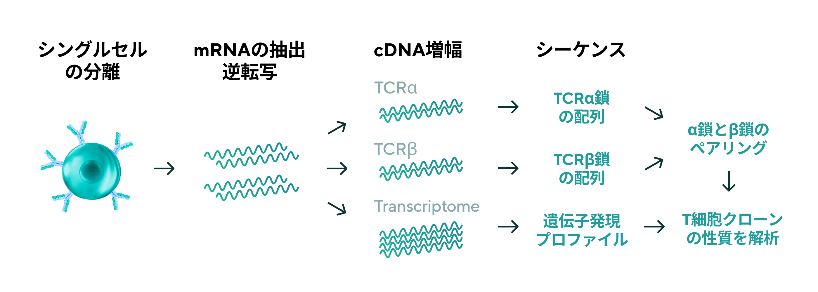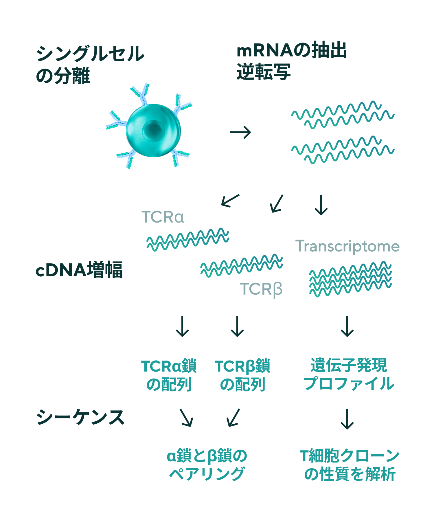 * TCRレパトア解析については、TCRレパトア解析のページもご参考とされてください。ここではTCRレパトア解析をシングルセルレベルで実施します。