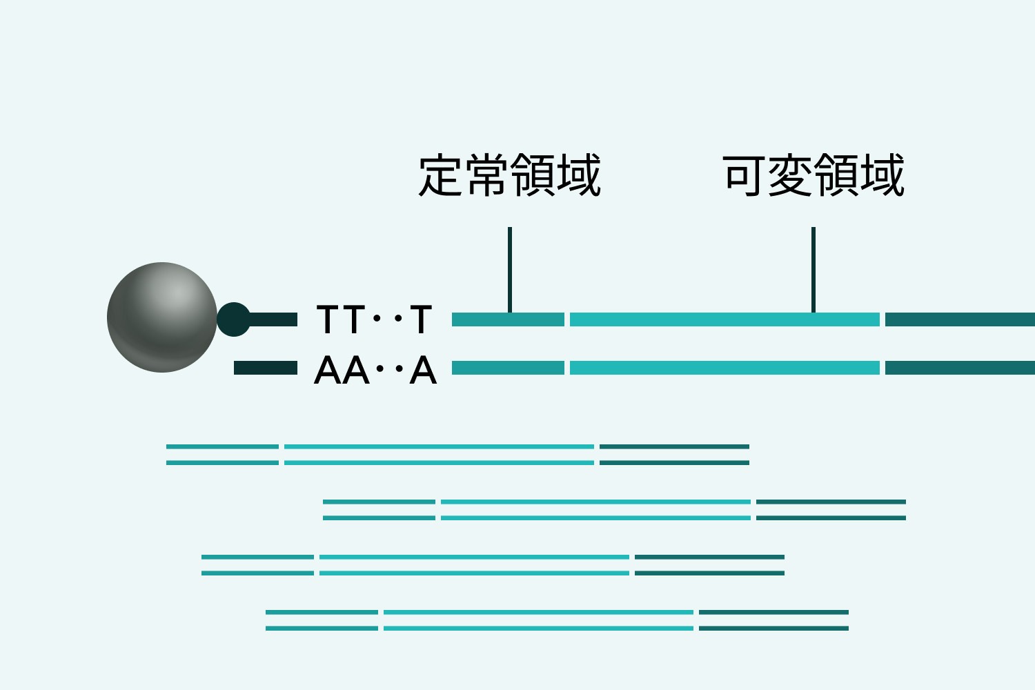 mRNAからcDNAを合成し、共通プライマーでTCR遺伝子を増幅することで、cDNAをスタートとして可変領域に対するmultiple primerで増幅する系に比較して高感度、非バイアスな解析が可能です。また、休止期のT細胞はTCR遺伝子発現量が低く (数コピー/細胞程度)、レパトア解析には検出感度が求められますが、IGT社の増幅法は既存技術の中でも特に感度の優れた方法を採用しています。