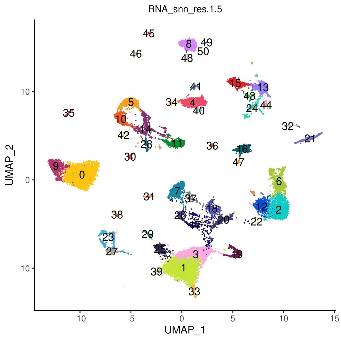 解像度パラメータを決定します。 (図5) ここでは、解像度1.5において平均シルエットスコアが最大なので、1.5が適切と考えて以降の解析に進んでいます。