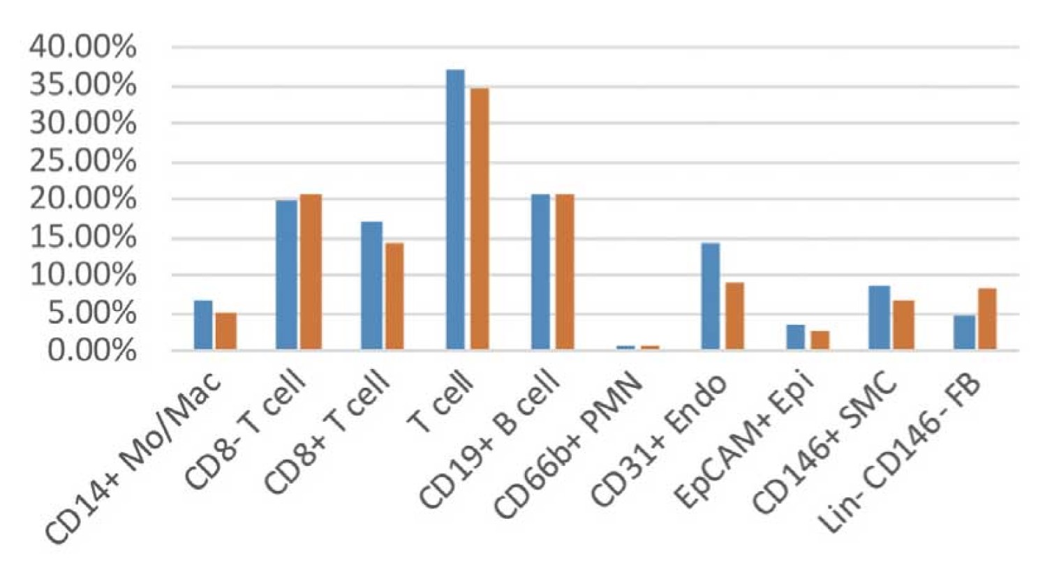 その他の手法の10X v2データはマクロファージを過大に検出しており、線維芽細胞画分を過小に検出していました。 (赤枠を参照)