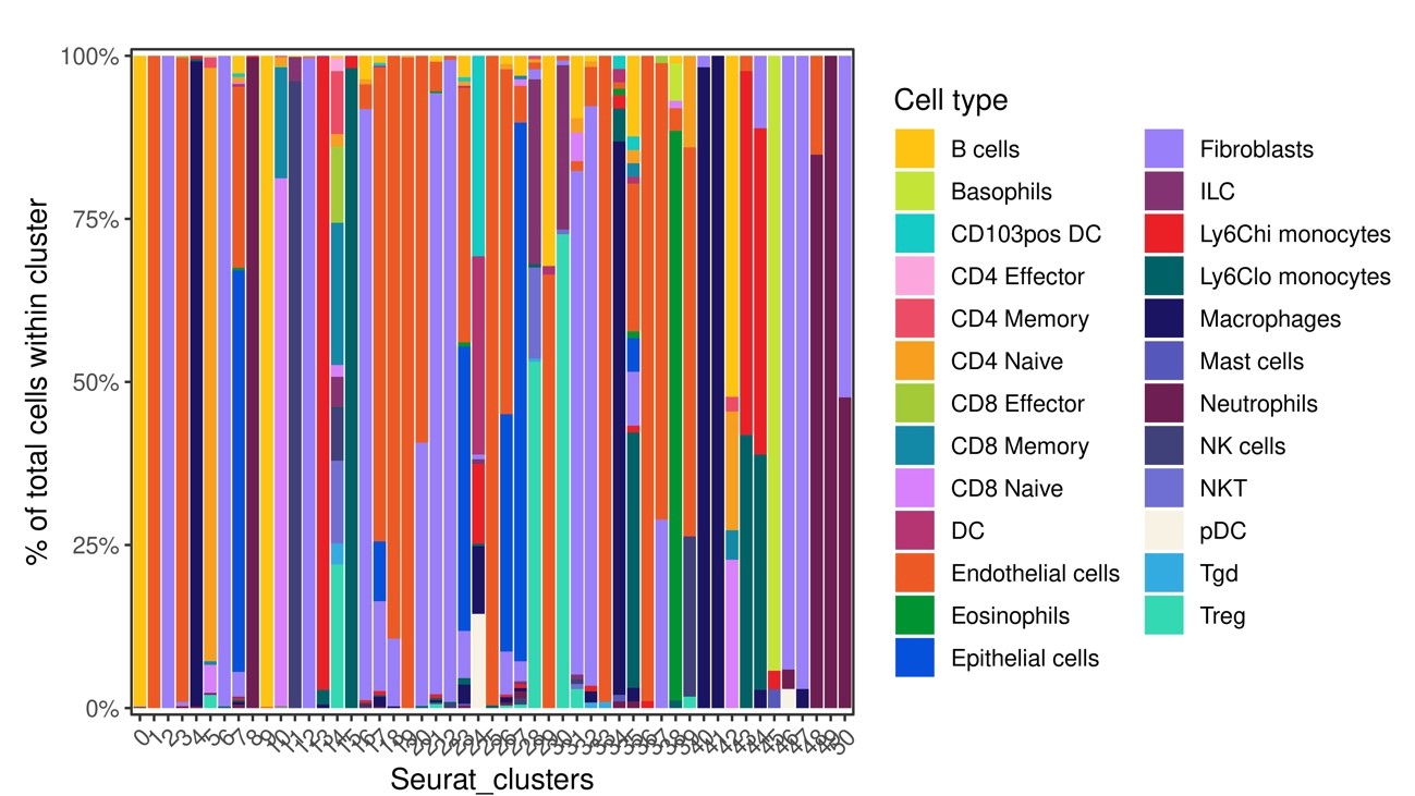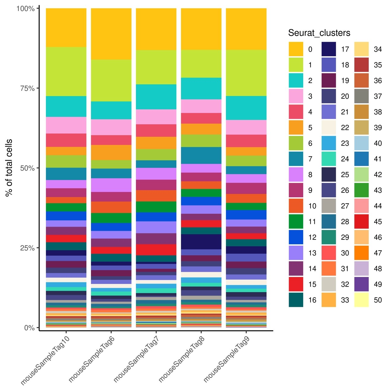 各細胞クラスターの全細胞に対する割合を、サンプルごとに積み上げ棒グラフで図示