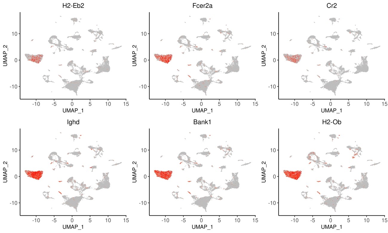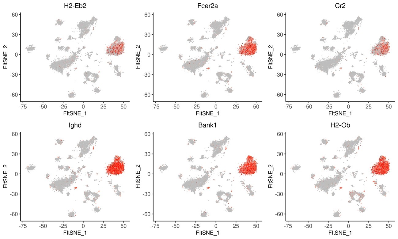 図11 各クラスターにおけるトップ6のマーカー遺伝子の発現パターン (Flt-SNE)