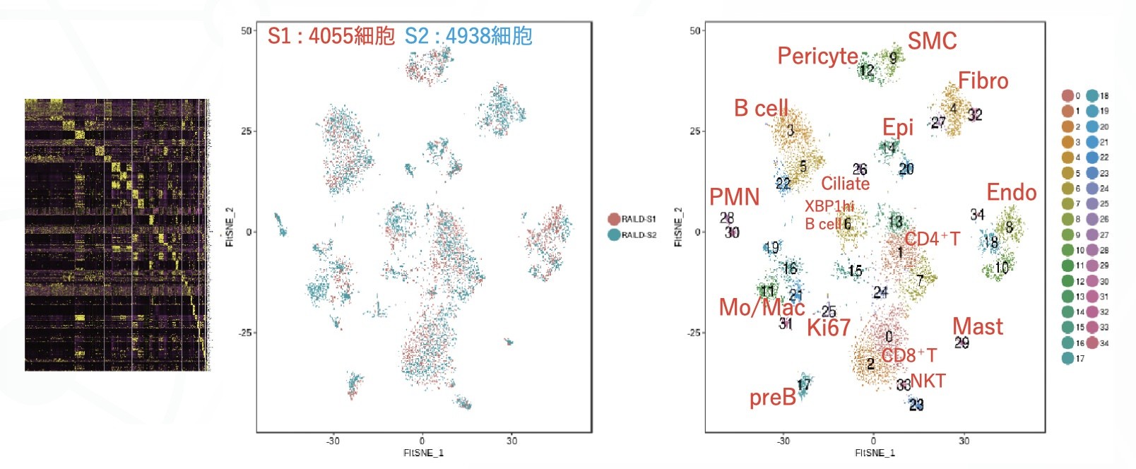 Bulk RNA-Seqでは細胞集団における平均的な遺伝子発現を検出するのに対して、個々の細胞の遺伝子発現を調べる single cell RNA-seq 解析(scRNA-seq)により、組織を構成する様々な細胞の機能・活性化状態が詳細に解析できます。