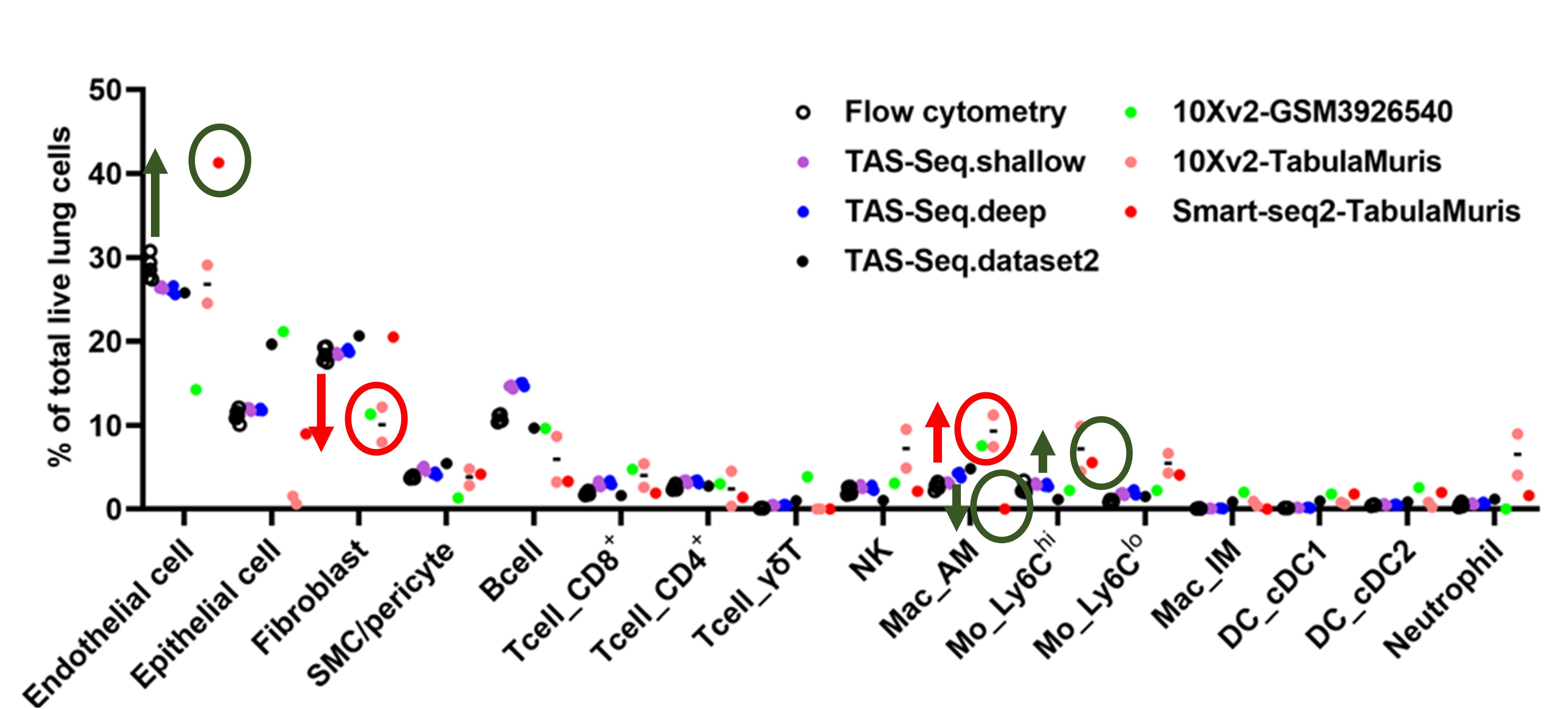 フローサイトメーターのデータと比較してTAS-seqではフローサイトメーターとの相関が高く、正確な細胞組成データを取得可能です。