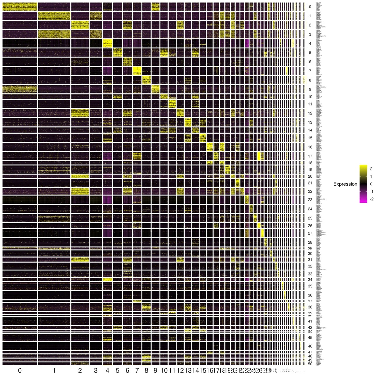 図10 各クラスターにおけるトップ20のマーカー遺伝子の発現パターンをヒートマップで図示