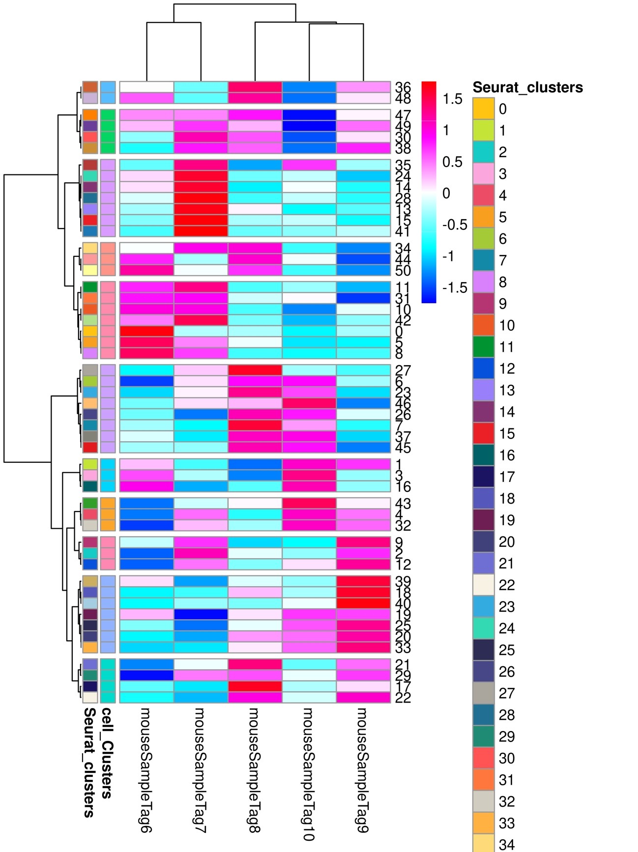 縦軸に各クラスターにおいて特徴的な20の遺伝子、横軸には各クラスターにある個々の細胞を並べ、個々の細胞における遺伝子発現量を右にあるスペクトルの色で表しました。クラスター内にある個々の細胞の遺伝子発現がどのくらい類似度があるか、あるいはクラスターごとの遺伝子発現の比較などができます。