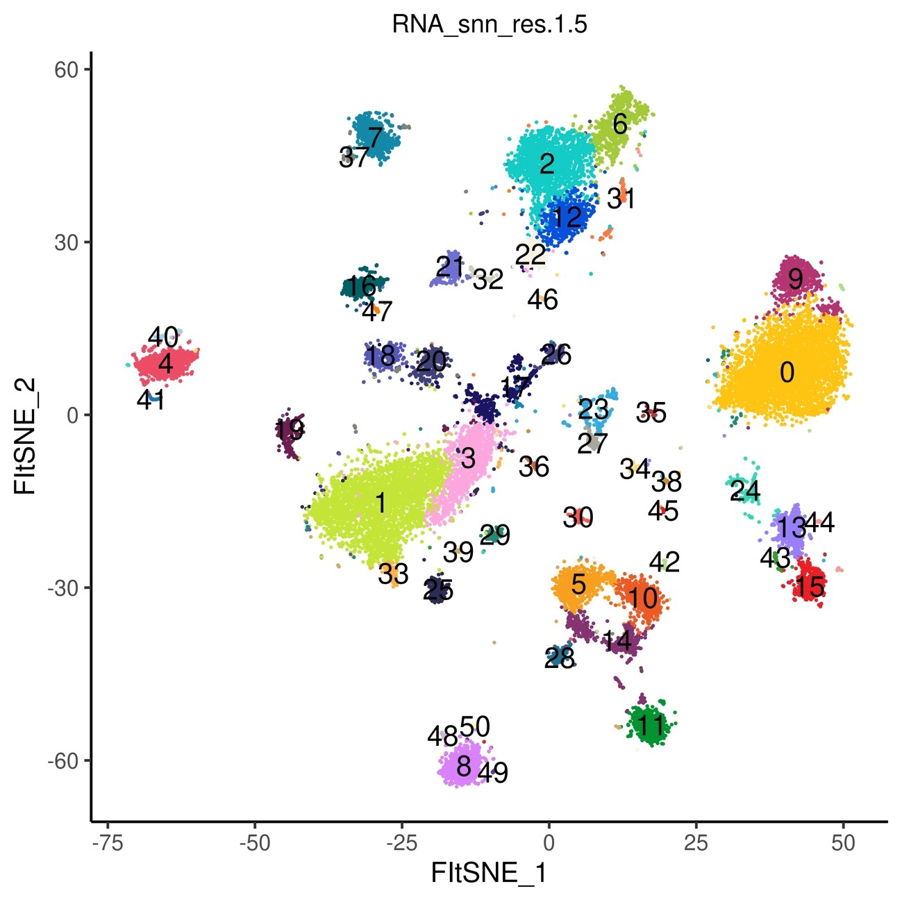FIt-SNE (George C. Linderman et al. Nat Methods 2019) を用いて、4)で行ったクラスタリング結果を視覚化します 。(図6) またUMAP解析でも視覚化します (図7)